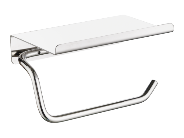Práctico dispensador de papel higiénico que integra un estante superior, perfecto para apoyar el teléfono móvil u otros objetos de cuidado personal. Fabricado en acero inoxidable S.304 con acabado cromado, este modelo de la serie Essential aúna comodidad y resistencia a la humedad. Su sistema de montaje es versátil, permitiendo fijarlo a la pared con adhesivo o tornillos.