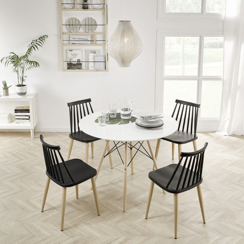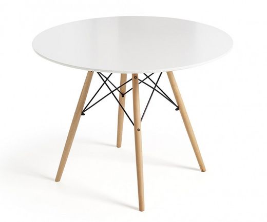 Fixed kitchen or dining table Wooden legs Beech in natural color Metal fasteners epoxy paint Matt white lacquered top, 19mm thick Measures. 100 cm diameter 75 cm height 61 cm between legs