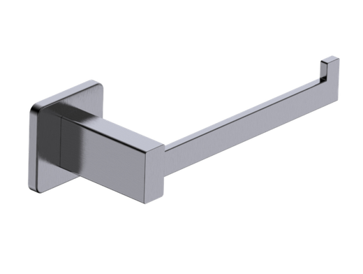 Soporte de pared para papel de la línea Technic, revestido en un sofisticado tono oscuro Black Gun Metal. Su diseño de brazo libre asegura un acceso inmediato al rollo, sumando un acento industrial y muy actual a la decoración del aseo.