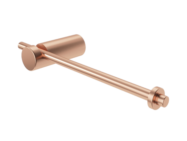 Dispensador de papel higiénico de la línea Time, embellecido con una vanguardista tonalidad oro rosa cepillado. Su estructura de brazo libre simplifica enormemente la tarea de reponer el rollo en el día a día, sumando un matiz de color único y contemporáneo al aseo.